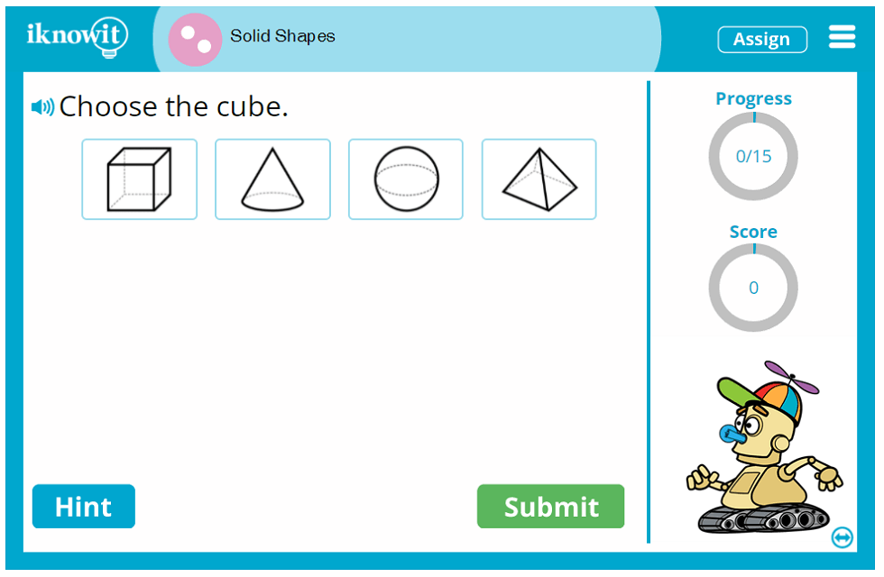 Put your students' geometry skills to the test with this interactive math game from iKnowIt.com. Your second grade students will practice identifying solid shapes and their attributes in this digital math game. Here are the skills your class will work on as they go through the math lesson:
