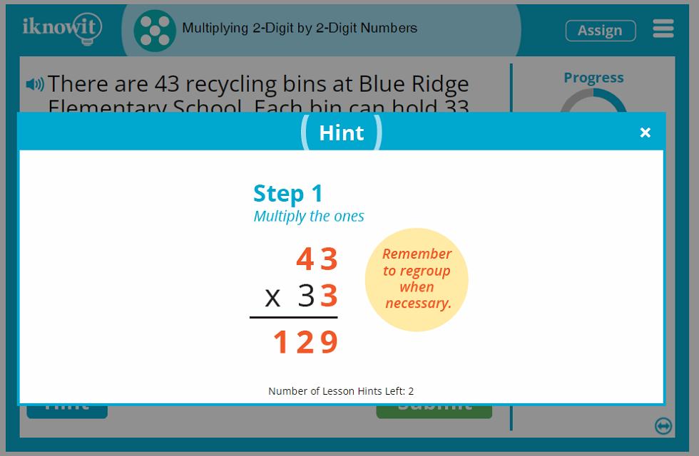 Throughout the interactive math practice experience, your fifth grade students will have several helpful features available to them. For example, they can click on the hint button when they get stuck on a problem. The hint will display a pictorial or written clue, such as "Step 1: Multiply the Ones," to point students in the right direction without giving away the solution to the multiplication problem. It's inevitable that students will make mistakes along the way, so the I Know It program helps students learn from mistakes by displaying a detailed explanation page when they solve a problem incorrectly. The explanation page shows the right answer accompanied by an easy-to-follow explanation.